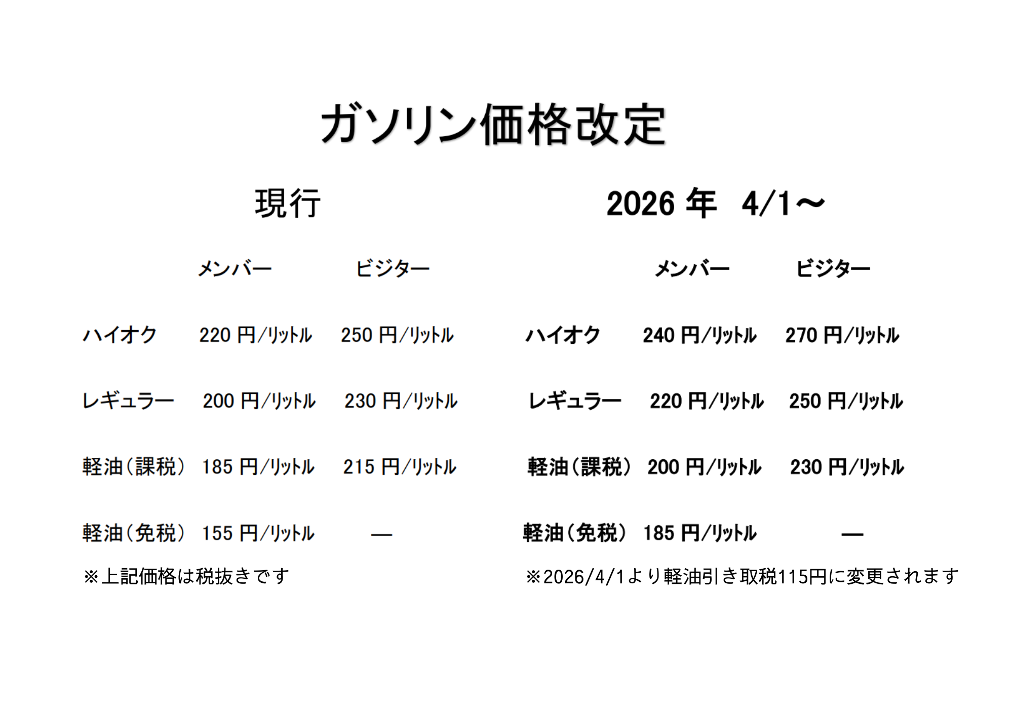 燃料の販売価格を2026年4月1日(水)より、変更させていただきます。