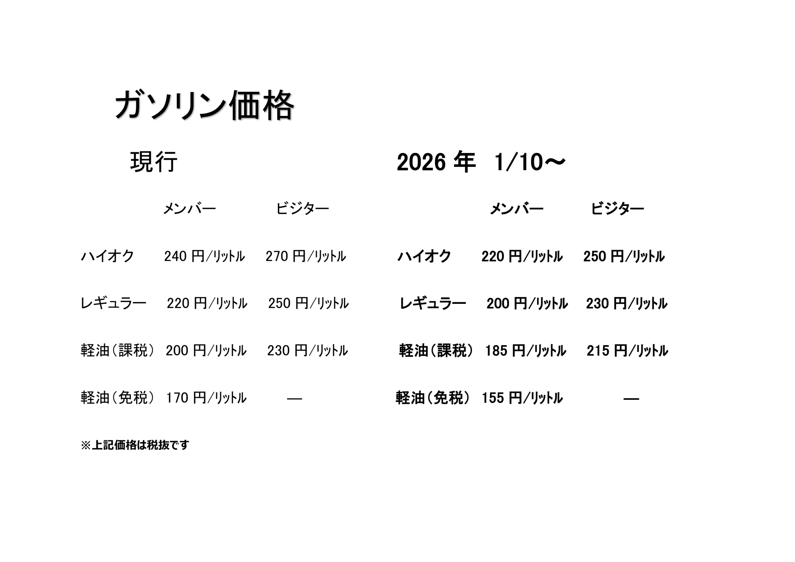 燃料の販売価格を2026年1月10日(土)より、変更させていただきます。